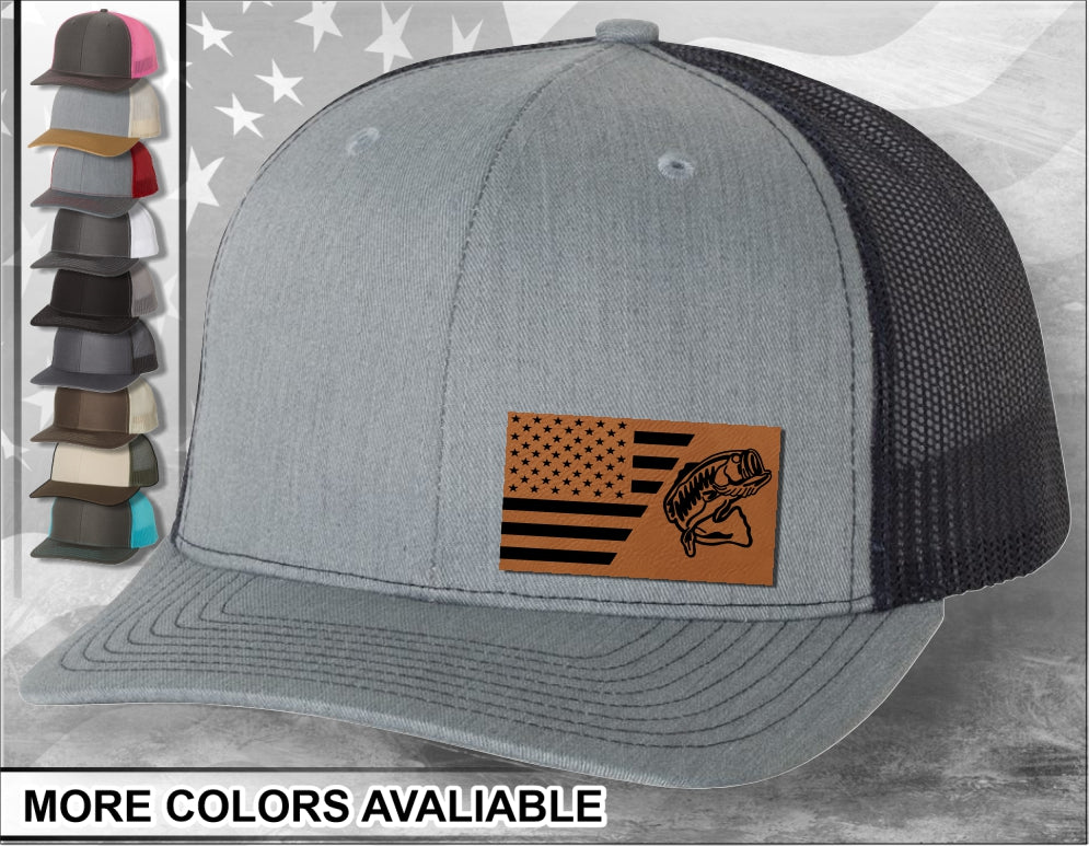 American Flag Bass Laser Engraved Leather Patch Trucker Hat