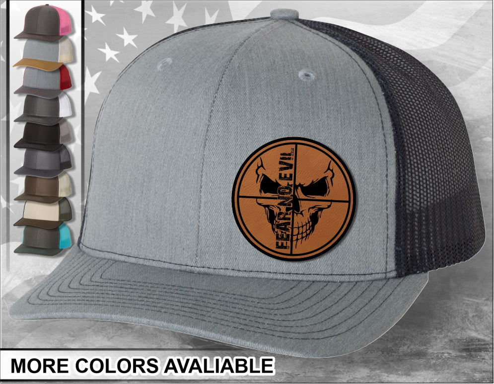 Fear No Evil Skull Laser Engraved Leather Patch Trucker Hat