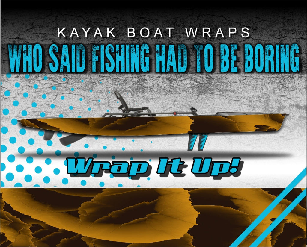 Who said fishing had to be boring?! Showcase your style with our universally sized kayak wraps and make your kayak look great. Or use them to give an old yak that fresh new look again! Since they are a universal size, they fit almost any brand kayak on the market. After extensive testing with this specialty wrap film we have been able to deliver a product specifically for the kayak community that is durable, waterproof, affordable and easy to apply. Once these materials were selected, we fired up the creativity and started producing these eye catching graphics. Each design detail has been meticulous rendered and assembled for vibrant, rich color ranges as a non-repeating pattern. There will not be any “cut and paste” effect with these designs. Our kayak wrap kits are digitally printed on professional grade, waterproof wrap film with industry leading durability. We use the BEST in vinyl application materials that implement the latest in ink and air release vinyl technology to make your wraps. Our graphics are digitally printed at 1080dpi for the highest resolution possible, brightest colors and an Ultra HD look. We then go the extra mile and apply a tough, clear laminate over the entire wrap kit. This laminating process provides extra protection as well as excellent UV and abrasion resistance and extended outdoor use. This means our graphics will stand up to the extremes of the outdoor environment, last longer and look great! This high performance waterproof wrap film has a grey removable, repositionable adhesive technology and has no visible air channels. These air channels help with adhesion, installation and longevity, as well as removability and will not leave a sticky residue left on your kayak if you ever decided to remove them. These graphics are easy to apply and easy to remove, just peel of the backing, apply and trim!