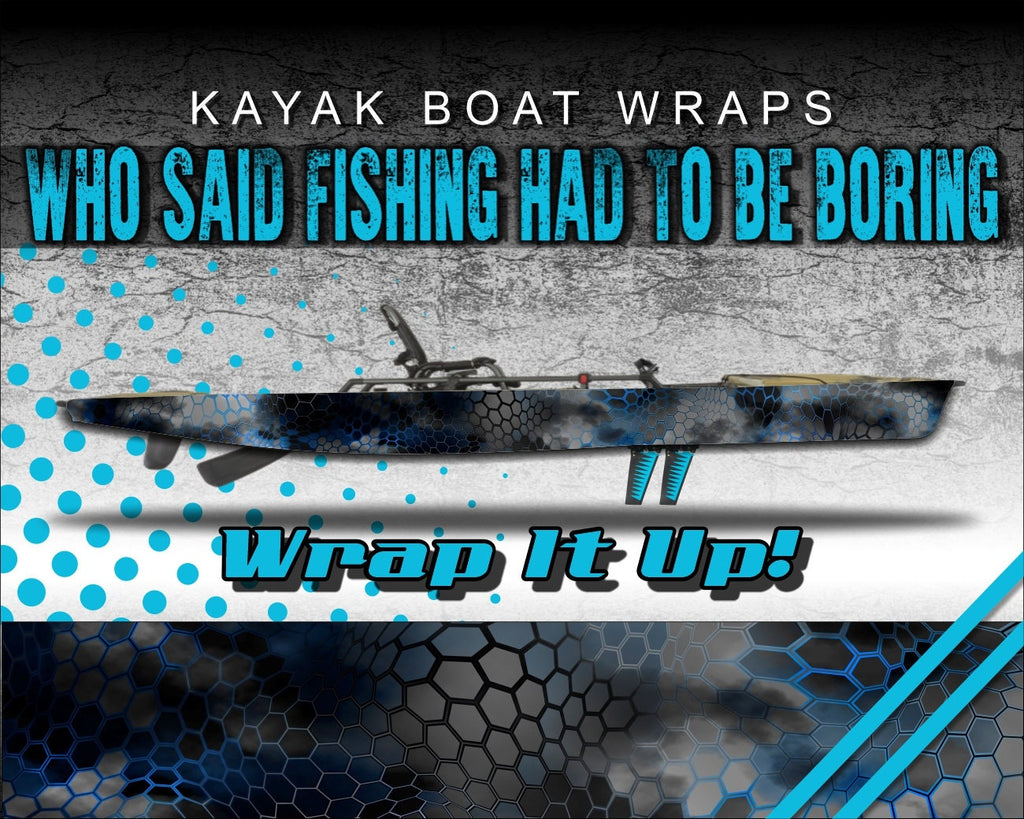 Who said fishing had to be boring?! Showcase your style with our universally sized kayak wraps and make your kayak look great. Or use them to give an old yak that fresh new look again! Since they are a universal size, they fit almost any brand kayak on the market. After extensive testing with this specialty wrap film we have been able to deliver a product specifically for the kayak community that is durable, waterproof, affordable and easy to apply. Once these materials were selected, we fired up the creativity and started producing these eye catching graphics. Each design detail has been meticulous rendered and assembled for vibrant, rich color ranges as a non-repeating pattern. There will not be any “cut and paste” effect with these designs. Our kayak wrap kits are digitally printed on professional grade, waterproof wrap film with industry leading durability. We use the BEST in vinyl application materials that implement the latest in ink and air release vinyl technology to make your wraps. Our graphics are digitally printed at 1080dpi for the highest resolution possible, brightest colors and an Ultra HD look. We then go the extra mile and apply a tough, clear laminate over the entire wrap kit. This laminating process provides extra protection as well as excellent UV and abrasion resistance and extended outdoor use. This means our graphics will stand up to the extremes of the outdoor environment, last longer and look great! This high performance waterproof wrap film has a grey removable, repositionable adhesive technology and has no visible air channels. These air channels help with adhesion, installation and longevity, as well as removability and will not leave a sticky residue left on your kayak if you ever decided to remove them. These graphics are easy to apply and easy to remove, just peel of the backing, apply and trim!