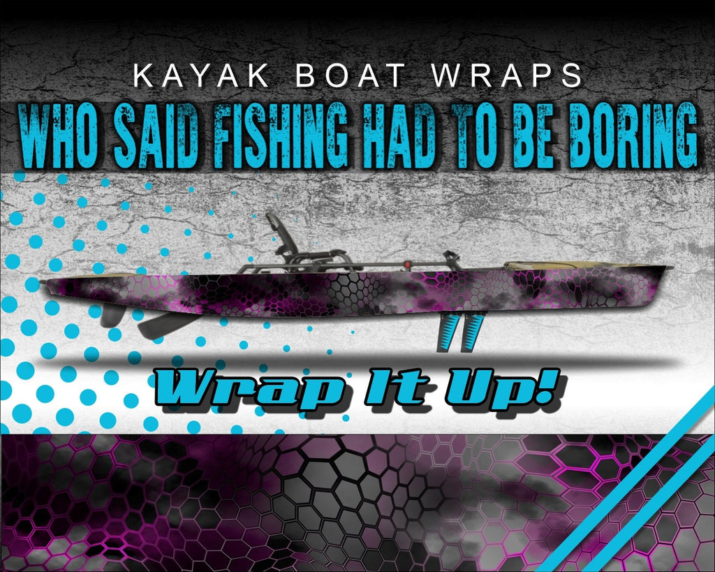 Who said fishing had to be boring?! Showcase your style with our universally sized kayak wraps and make your kayak look great. Or use them to give an old yak that fresh new look again! Since they are a universal size, they fit almost any brand kayak on the market. After extensive testing with this specialty wrap film we have been able to deliver a product specifically for the kayak community that is durable, waterproof, affordable and easy to apply. Once these materials were selected, we fired up the creativity and started producing these eye catching graphics. Each design detail has been meticulous rendered and assembled for vibrant, rich color ranges as a non-repeating pattern. There will not be any “cut and paste” effect with these designs. Our kayak wrap kits are digitally printed on professional grade, waterproof wrap film with industry leading durability. We use the BEST in vinyl application materials that implement the latest in ink and air release vinyl technology to make your wraps. Our graphics are digitally printed at 1080dpi for the highest resolution possible, brightest colors and an Ultra HD look. We then go the extra mile and apply a tough, clear laminate over the entire wrap kit. This laminating process provides extra protection as well as excellent UV and abrasion resistance and extended outdoor use. This means our graphics will stand up to the extremes of the outdoor environment, last longer and look great! This high performance waterproof wrap film has a grey removable, repositionable adhesive technology and has no visible air channels. These air channels help with adhesion, installation and longevity, as well as removability and will not leave a sticky residue left on your kayak if you ever decided to remove them. These graphics are easy to apply and easy to remove, just peel of the backing, apply and trim!