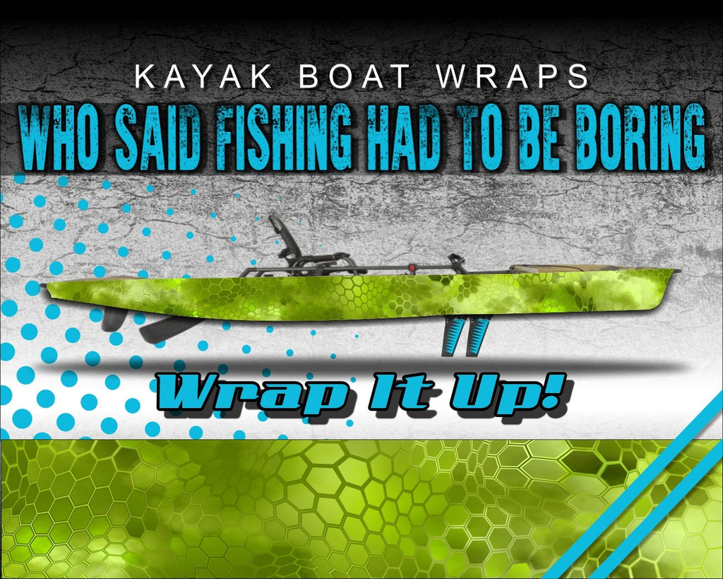 Who said fishing had to be boring?! Showcase your style with our universally sized kayak wraps and make your kayak look great. Or use them to give an old yak that fresh new look again! Since they are a universal size, they fit almost any brand kayak on the market. After extensive testing with this specialty wrap film we have been able to deliver a product specifically for the kayak community that is durable, waterproof, affordable and easy to apply. Once these materials were selected, we fired up the creativity and started producing these eye catching graphics. Each design detail has been meticulous rendered and assembled for vibrant, rich color ranges as a non-repeating pattern. There will not be any “cut and paste” effect with these designs. Our kayak wrap kits are digitally printed on professional grade, waterproof wrap film with industry leading durability. We use the BEST in vinyl application materials that implement the latest in ink and air release vinyl technology to make your wraps. Our graphics are digitally printed at 1080dpi for the highest resolution possible, brightest colors and an Ultra HD look. We then go the extra mile and apply a tough, clear laminate over the entire wrap kit. This laminating process provides extra protection as well as excellent UV and abrasion resistance and extended outdoor use. This means our graphics will stand up to the extremes of the outdoor environment, last longer and look great! This high performance waterproof wrap film has a grey removable, repositionable adhesive technology and has no visible air channels. These air channels help with adhesion, installation and longevity, as well as removability and will not leave a sticky residue left on your kayak if you ever decided to remove them. These graphics are easy to apply and easy to remove, just peel of the backing, apply and trim!