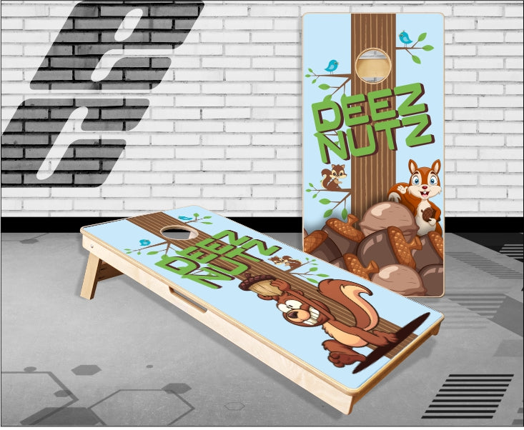 We set out to manufacture an extremely durable set of boards that were also aesthetically pleasing for both the tournament player and the average backyard tosser alike. All of our cornhole board graphics are printed directly to the wood using industry leading UV print technology. They are then UV clear coated to protect the printed artwork and add the prefect finish for gameplay. built using 3/4” plywood and are precision cut on a state of the art CNC machine in house. The top deck sits approximately 12” off the back and the 6” hole is perfectly centered 9” from the top. Our frames feature dual built in handles, one on each side of the board as well as two support braces in the middle for an extremely durable build and reduced bounce. We took the craftsmanship a step further and inset the 2 center braces and leg brace into dado grooves for added durability and aesthetics. We hid the pocket hole screws on the underside of the boards that join the frames together and secure the frames to the tops for the heavy duty strength and seamless appearance we were striving for. The tops and hole, as well as all edges of the frames have been hand routed over for a nice, round edge. The radius on the four corners of the 3/4” top playing deck not only look nice, but also serve to prevent your bags from hitting sharp corners that can lead to premature bag failure. These boards are regulation weight and size and measure approximately 47.75"x23.75". This rugged build paired with the aesthetically pleasing craftsmanship will be a set you will be proud to take out and play on for years to come.