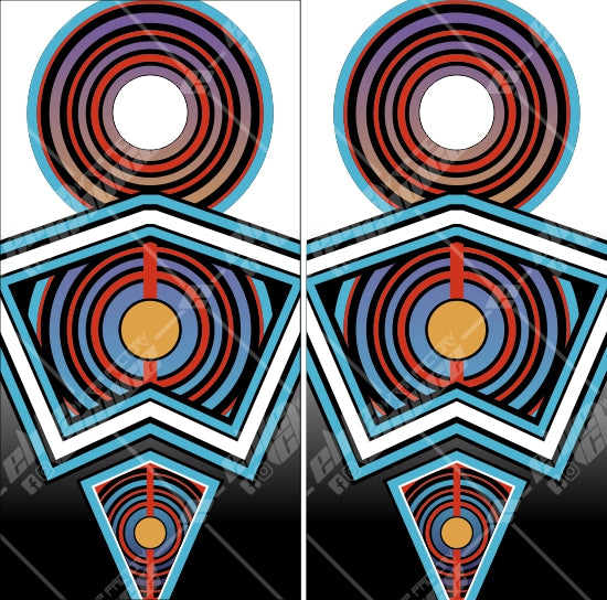 Center hole is not pre-cut and will not be printed on the design. The only time a circle will be printed is if once it is applied to the board and trimmed, creating a ring around the hole. This allows you to install the graphic to your custom built board, then cut the hole out with a razor blade. Once the wraps are applied, trim off the outside edges to give yourself that 1/8" or 1/4" border to set the look off! This will also allow the edge of the wood to protect the edge of the wraps and significantly extend their lifespan vs. cutting the wraps flush with the edge of the boards.